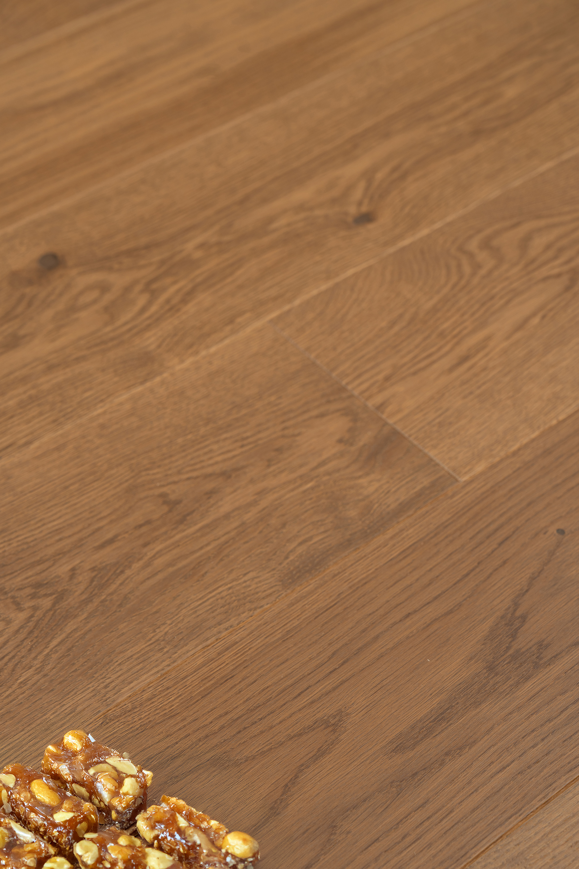 Паркетная доска — теплого, медово-карамельного оттенка. Тот самый уютный цвет, что и у конфет «Грильяж»: сладкий орех в золотистой карамели. Пол, по которому хочется ходить босиком.