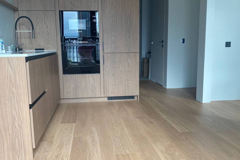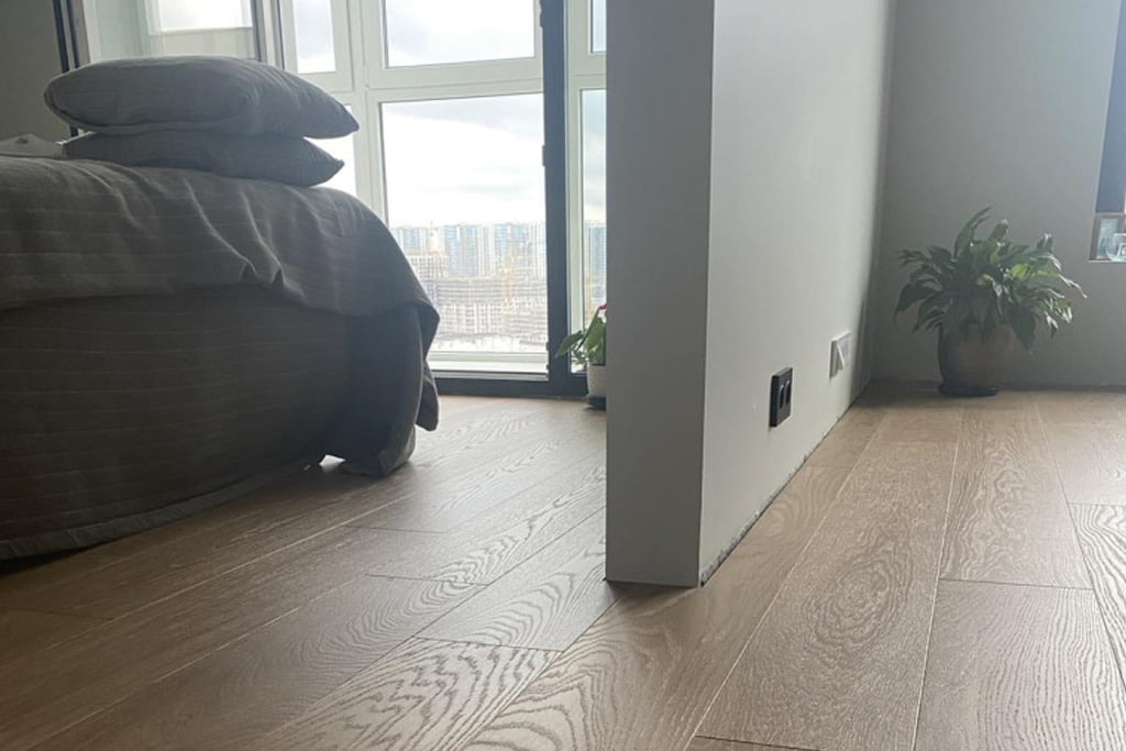 В проекте квартиры в ЖК «Левада» (Минск, Беларусь) мы использовали паркетную доску Karelia Oak Story Protea Deep Matt, чтобы подчеркнуть естественную эстетику пространства. Натуральный дуб с глубоким матовым покрытием создаёт атмосферу уюта и спокойствия, а однополосная структура подчёркивает фактуру дерева.